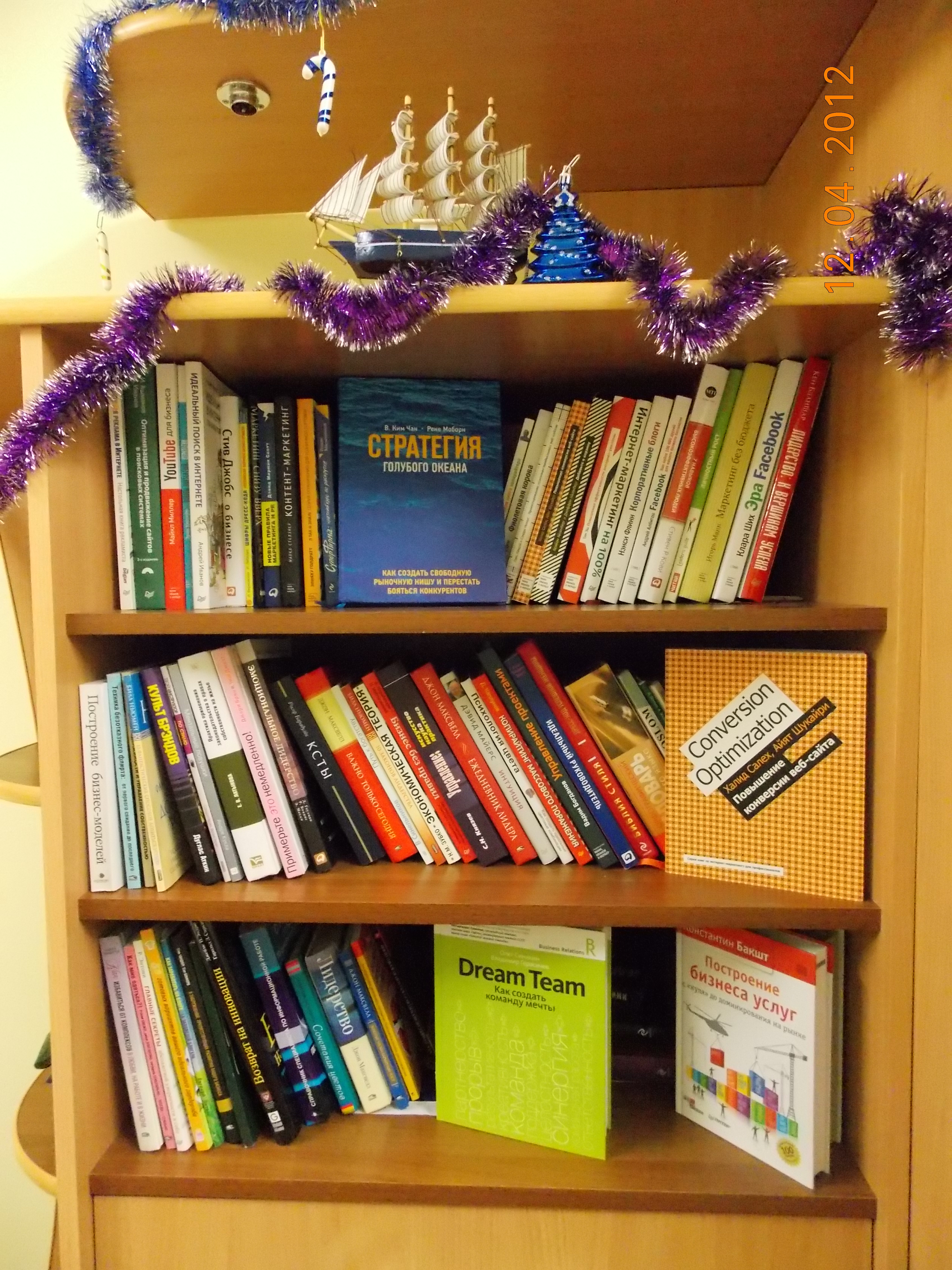 На книжной полке компании «МебельВместе» разливается голубой океан — бестселлер «Стратегия голубого океана». С «DreamTeam» в компании нет никаких проблем, и взаимодействие к клиентами организовано как надо благодаря книге «Построение бизнеса услуг».