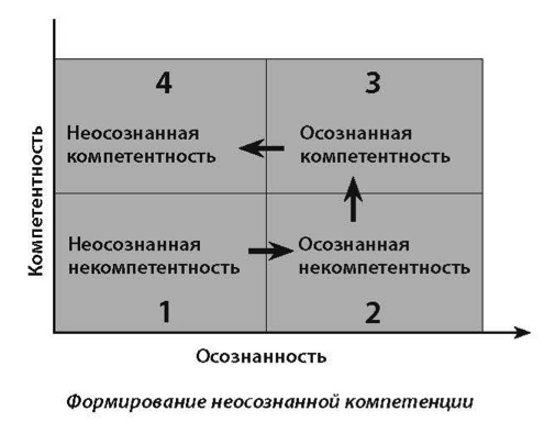 Главная задача в выработке привычки — перейти от неосо­знанной некомпетентности в правильном образе жизни к неосознанной компетентности (см. рисунок). Что это означает?