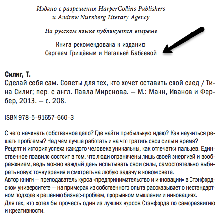 Вскоре я вернулась на родину и примкнула к команде МИФа. Тогда-то я и вспомнила об этой книжке и написала о ней нашему книжному скауту. Оказалось, что помимо меня, книгу успел предложить издательству один из наших читателей — Сергей Грищев. Книгу издали, и теперь и мне, и ему положено по 3 бесплатных экземпляра книги. А вот и наши имена в книге:
