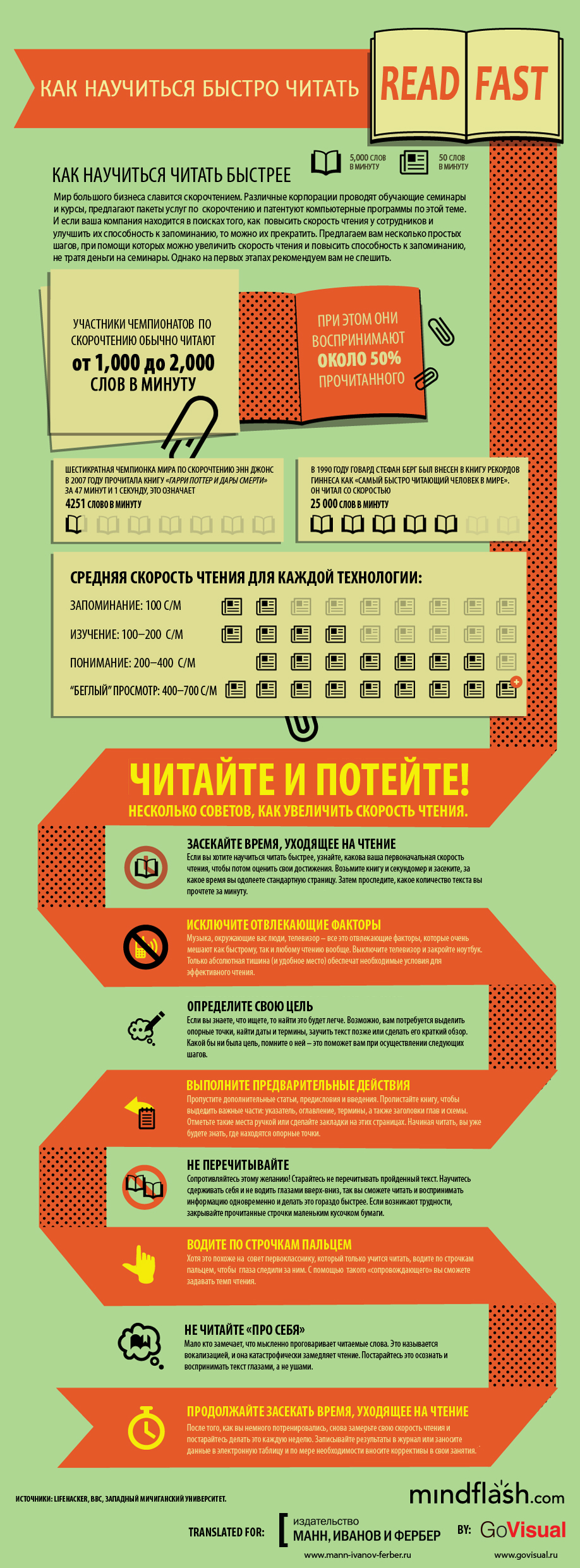 «У вас выходит так много отличных новинок, что некогда читать», — все чаще пишут нам в соцсетях. В ответ мы нашли и перевели на русский язык инфографику о скорочтении и поделились ею с нашими партнерами на Лайфхакере, а теперь делимся и с вами. Сделать картинку русской нам помогли ребята из GoVisual.