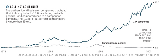 jim_collins_morten_t_hansenПервоначальный список из 20 400 компаний мы пропустили через 11 последовательных сит, чтобы отобрать лишь те, которые полностью соответствовали всем критериям (мы рассматривали период по 2002 г.). В итоге осталось только 7 компаний. Наших победителей мы обозначили как «10Х», потому что они не просто выжили, не просто добились умеренного успеха, а достигли величия. Каждая из 10Х компаний превосходит средний результат по отрасли как минимум в 10 раз.