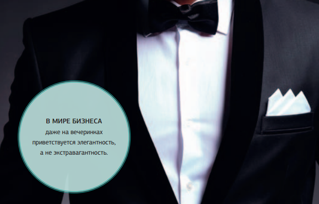 У делового человека должно быть не менее двух-трех костюмов. Рубашка должна хорошо сидеть на вас и иметь качественные манжеты и воротник. Брюки должны доходить до каблука ботинок, когда вы стоите, а впереди образовывать одну мягкую складку над подъемом ноги. Бизнесмен может носить только одно кольцо — обручальное. Стоимость часов не должна превышать двух (максимум трех) месячных окладов.