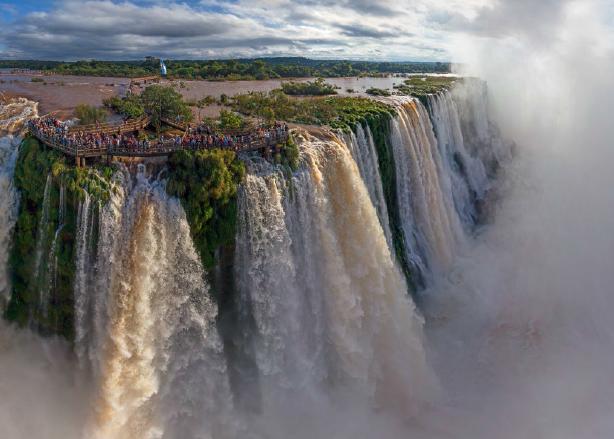 Каскад водопадов расположился на реке Игуасу на бразильско-аргентинской границе. В этом месте река делает крутой поворот и 275 потоками, разделенными скалистыми островами, низвергается в U-образный разлом в толще базальта. Зрелищем падающей воды можно наслаждаться часами.