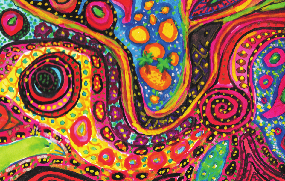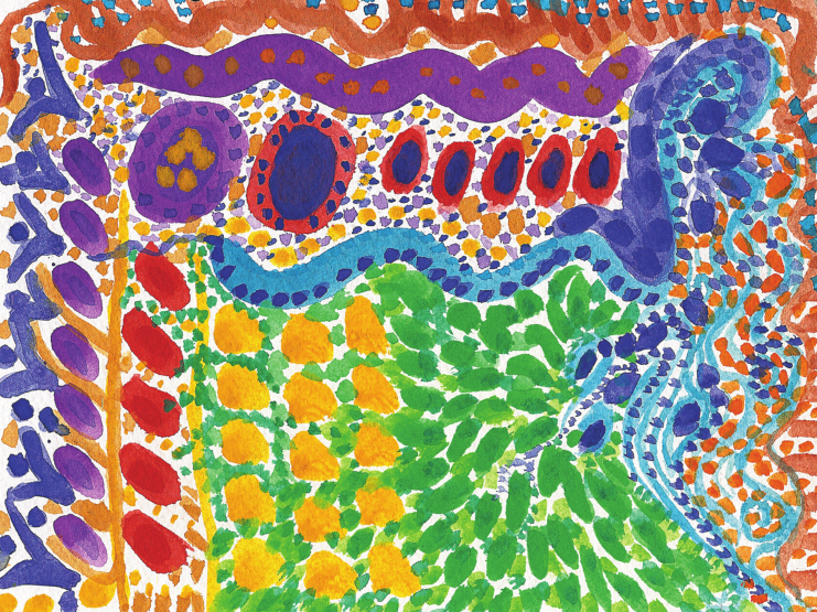Отправимся в путь, рисуя линию на бумаге. Мы не будем делать ничего особенного, просто позволим кисти вести нас. Возможно, линия станет волнистой или превратится в нечто бесформенное. Что бы ни выходило из-под нее, двигайтесь легко и свободно. Закончив, посмотрите на получившиеся линии. Они напомнили вам что-то? Выберите один кружок или завиток и дополните его как можно большим числом деталей.