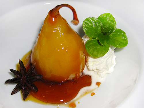 Закройте крышкой и томите на слабом огне 15–20 минут до мягкости груш. Выньте груши и отложите. Добавьте к сиропу сливки и кальвадос и продолжайте готовить, не накрывая крышкой, пока карамель не уварится до трети объема. Подавайте с ванильным мороженым или полив небольшим количеством сливок. Чтобы придать этому блюду еще больше вкуса, попробуйте добавить в карамель корицу и имбирь одновременно с апельсиновым соком и грушами.