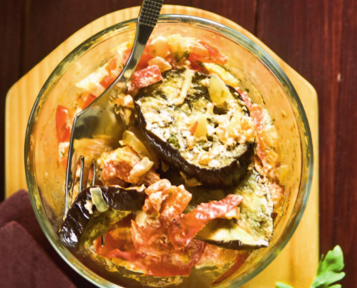 В сковороде на оставшемся масле спассеруйте лук, добавьте чеснок, затем помидоры. Тушите 2–3 минуты. Снимите с огня, немного остудите. Смешайте овощи с йогуртом, посолите, поперчите. Баклажаны уложите в огнеупорную керамическую или стеклянную форму, залейте приготовленным соусом и запекайте 10–15 минут в духовке, разогретой до 160 °С. При подаче посыпьте баклажаны зеленью.