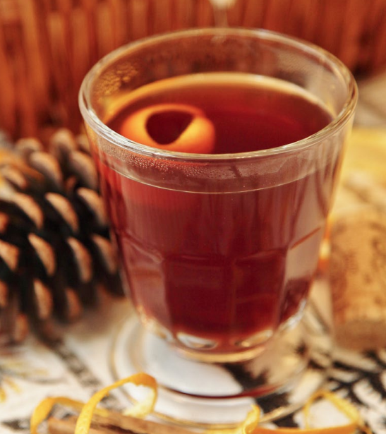 В кастрюле смешайте клюквенный морс, коньяк, красное и белое вино. Добавьте сахар, гвоздику, корицу и разрезанный на дольки апельсин, не снимая с него кожуру. Накройте крышкой и оставьте томиться на медленном огне около 4 часов. Не доводите глинтвейн до кипения! Он сразу же теряет большинство своих вкусовых качеств. Спустя указанное время снимите кастрюлю с огня, положите в напиток лавровый лист и настаивайте под крышкой еще полчаса — за это время лавровый лист придаст глинтвейну очень приятную и деликатную пряную нотку. Подавайте горячим.