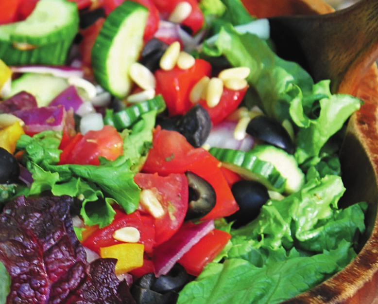 Соедините зеленый салат, лук, перец, помидоры, огурцы, маслины и орехи в большой салатнице. Для приготовления заправки смешайте в миске покрошенный тофу с остальными ингредиентами и оставьте мариноваться в течение часа. Полейте салат заправкой и встряхните.
