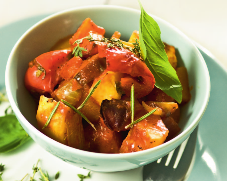 На отдельную сковороду налейте оставшееся масло, нагрейте его. Положите на сковороду нарезанные морковь и картофель, обжаривайте их до готовности. В форму для запекания уложите все подготовленные овощи, добавьте пассату (готовое пастеризованное томатное пюре), перемешайте и запекайте в духовке 15–20 минут при 200 °С (180 °С для духовки с конвектором).