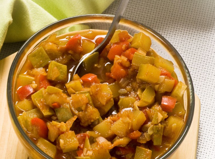 Кабачки, баклажаны, лук и сладкий перец нарежьте кубиками. На разогретую сковороду налейте 1 столовую ложку масла, добавьте лук, жарьте его до размягчения на слабом огне. Добавьте к луку кабачок, баклажан и перец. Тушите их в собственном соку около 20 минут. Добавьте пряности и чеснок за 5 минут до готовности.