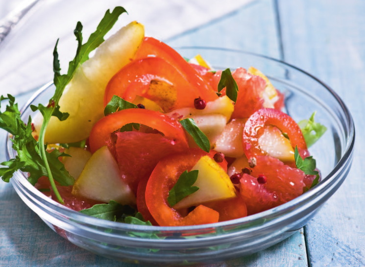 Сладкий перец, удалив плодоножку с семенами, нашинкуйте тонкой соломкой. Листья салата нарвите, уложите в салатник. Сверху выложите подготовленные фрукты и сладкий перец, полейте их уксусом, маслом, посолите и поперчите, перемешайте. Зелень петрушки мелко порубите и посыпьте салат.
