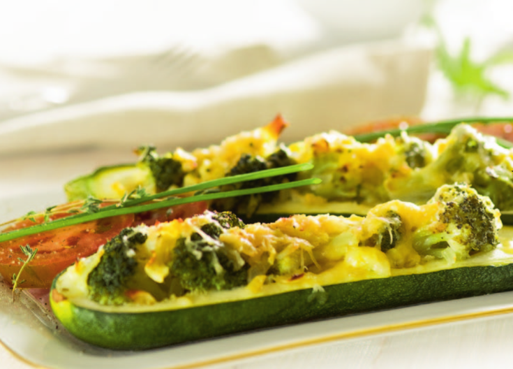 и поперчите, добавьте йогурт, осторожно перемешайте. Полученной массой заполните половинки кабачков и запекайте их 20–25 минут при 180 °С. За 3–5 минут до готовности посыпьте кабачки тертым сыром.
