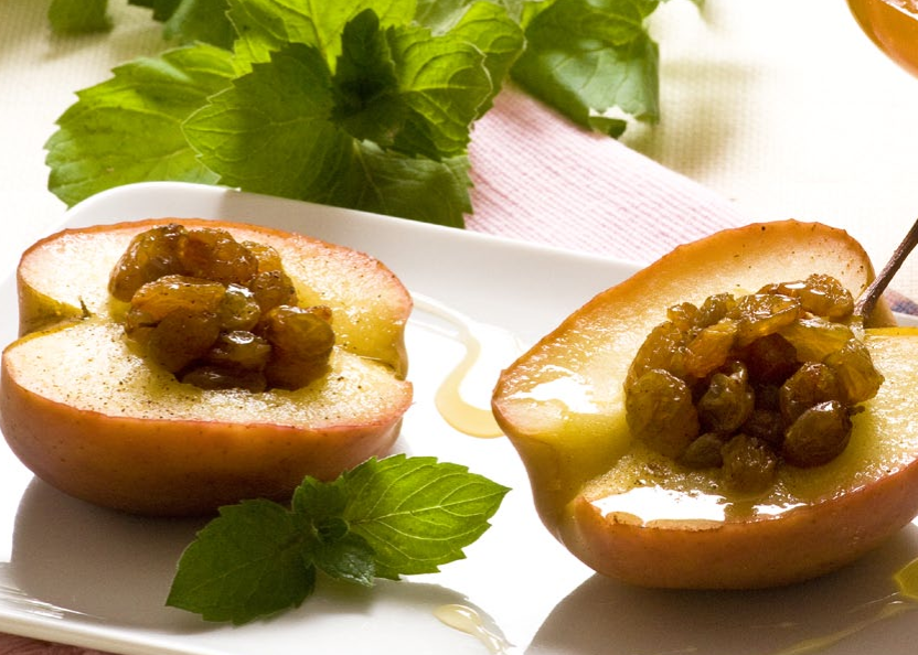 Яблоки разрежьте пополам, удалите сердцевину. Мед смешайте с корицей и изюмом, наполните половинки яблок этой смесью. Положите яблоки в контейнер-пароварку, поставьте в мультиварку на 15 минут.