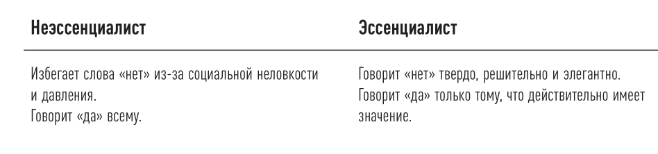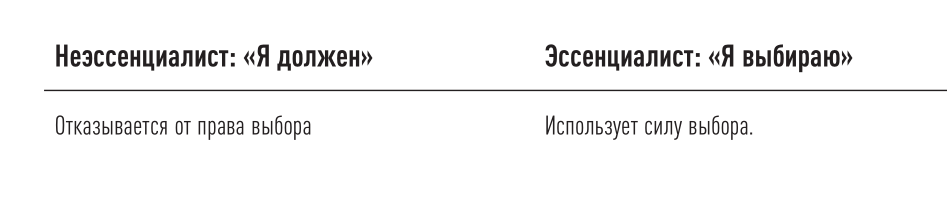 Неэссенциалист готов гнаться за первым попавшимся шансом, а значит, у него нет времени вдуматься, что он делает. Путь эссенциалиста — в исследовании и оценке большого количества альтернатив, а уже только потом в выборе единственной.