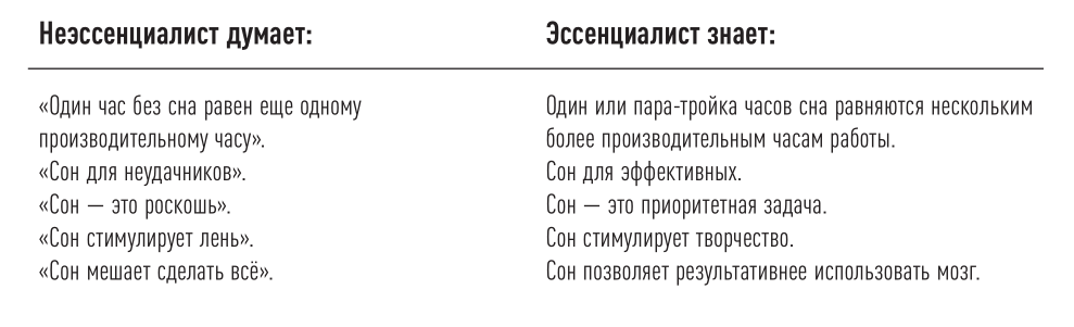 Для неэссенциалистов сон — всего лишь еще одно бремя их переполненной, занятой, но всегда продуктивной жизни. Поэтому их в любое время может настичь переутомление. Эссенциалисты не сокращают время сна. Защищая свои активы, они наполняют жизнь запасом энергии, творческой силы и способности решать задачи.