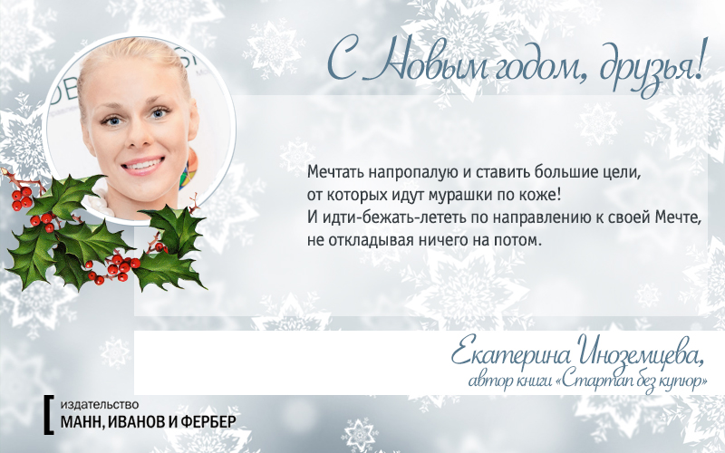 — Успех начинается с внутреннего ощущения. Почувствуйте себя успешными, и вы станете успешными. Представьте, что вы — сверхуспешный проект: выделите ключевые достижения, назовите таланты, которыми вы действительно гордитесь, вспомните события и поступки, которые делают вас уникальным человеком на планете. Успех — это, прежде всего, внутренний огонь и готовность перевернуть этот мир одним рычагом. Идите вперед к своей мечте, делайте невозможное, рискуйте и выигрывайте. Подобное притягивает подобное — внешний, социальный успех не заставит себя ждать. Я желаю всем читателям мечтать и ставить большие цели, от которых идут мурашки по коже! И идти-бежать-лететь по направлению к своей Мечте, не откладывая ничего на потом.