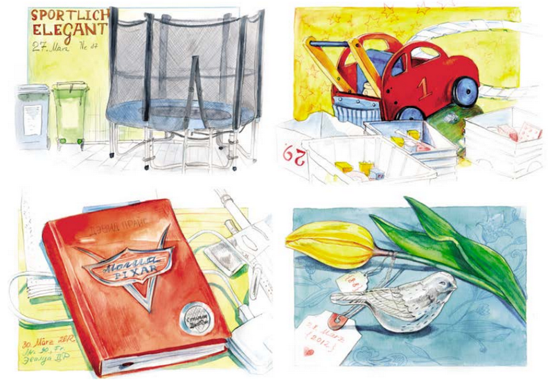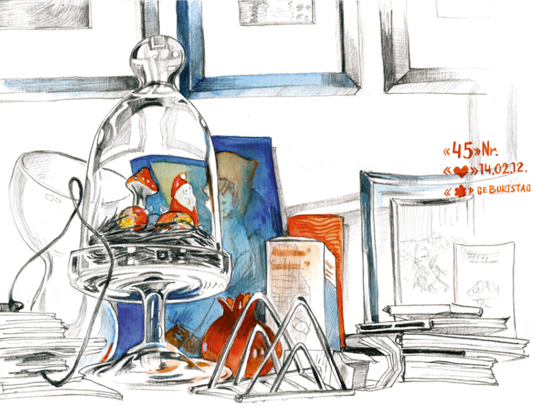Если у вас есть дети, можете взять темой рисовального года игрушки, записи детских рассуждений, праздники и другие большие и маленькие вещи и события. По зарисовкам моего года вы можете убедиться, насколько благодатна эта тема.