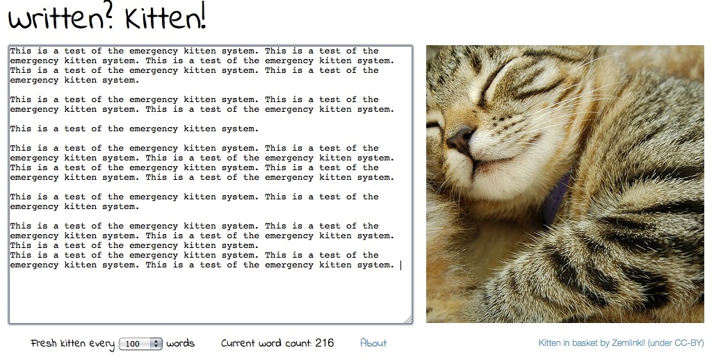Еще один забавный пример — веб-сайт под названием Written? Kitten! Его задача — мотивировать авторов. Вы задаете себе цель, например написать 3000 или 5000 слов, и как только вы выполняете норму, показывается картинка с котенком. Для любителей кошек это неплохой стимул.