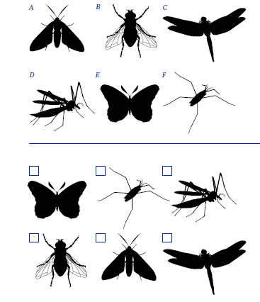 Внимательно рассматривайте два первых ряда насекомых в течение полутора минут. Запомните шесть насекомых и буквы, которыми они обозначены. Затем посмотрите на нижний рисунок и скажите, какая буква соответствует каждому насекомому. Сравните с оригиналом и исправьтесь, если допустили ошибку.