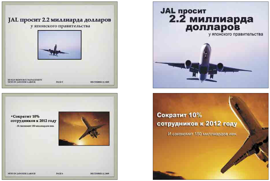 5. Совмещение языков на одном слайде может быть эффективным, если взять шрифты разного размера. Один язык должен быть визуально подчинен другому. Если вы делаете презентацию на японском, то японский текст изобразите крупнее английского (но в гармоничном сочетании). Если говорите на английском, его и выводите на первый план. Когда же текст на обоих языках одинакового размера, это создает визуальный беспорядок, так как текстовые элементы конкурируют друг с другом за привлечение внимания. Метод помещения одного языка в очевидно преимущественную позицию по сравнению с другим обычно используется на знаках в общественном транспорте и рекламе.