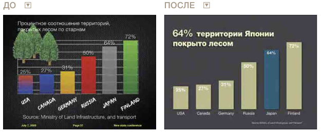 1. Простота в дизайне — звучит легко, но достичь ее непросто. Наша цель заключается в создании таких изображений, которые будут подтверждать идею наиболее легким для понимания образом и делать послание настолько ясным, насколько это возможно. Сравните: левый слайд слишком насыщен цветами — взгляд перепрыгивает от одного цветного элемента к другому, не задерживаясь ни в одной конкретной точке. О чем этот слайд? Трудно сказать. На правом слайде мы в первую очередь замечаем крупный текст, а затем — синюю полоску (или наоборот), после чего переключаем внимание на другие элементы диаграммы.
