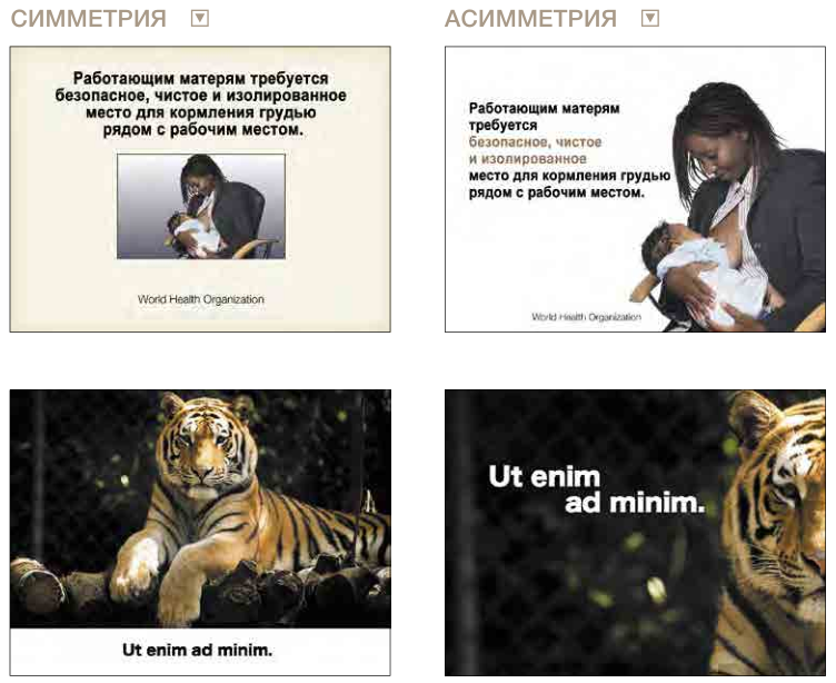 7. Асимметрия — это естественно, динамично и привлекательно. В асимметричном изображении пустое пространство не просто активно, а играет ключевую роль в гармоничном и сбалансированном сочетании положительных элементов. Асимметричный баланс элементов разного размера, веса, цвета и так далее — эффективный способ привлечь внимание зрителя.