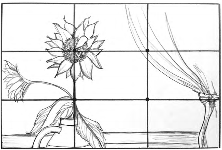 Вот как это работает: сетка, разбивающая лист на девять секторов, помогает вам расположить фокусную точку или главные графические элементы композиции вдоль линий решетки или на их пересечении. Фокусная точка располагается в месте пересечения одной пары линий и уравновешивается второстепенными объектами на противоположном пересечении. Горизонтальные линии решетки также могут представлять линию горизонта в пейзаже.