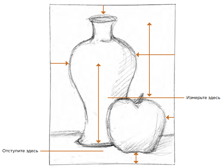 Для определения относительных высоты и ширины, а также углов изображаемого предмета вы можете пользоваться таким приемом, как прикидка. Используйте карандаш в качестве измерительного инструмента для сравнения относительных размеров.