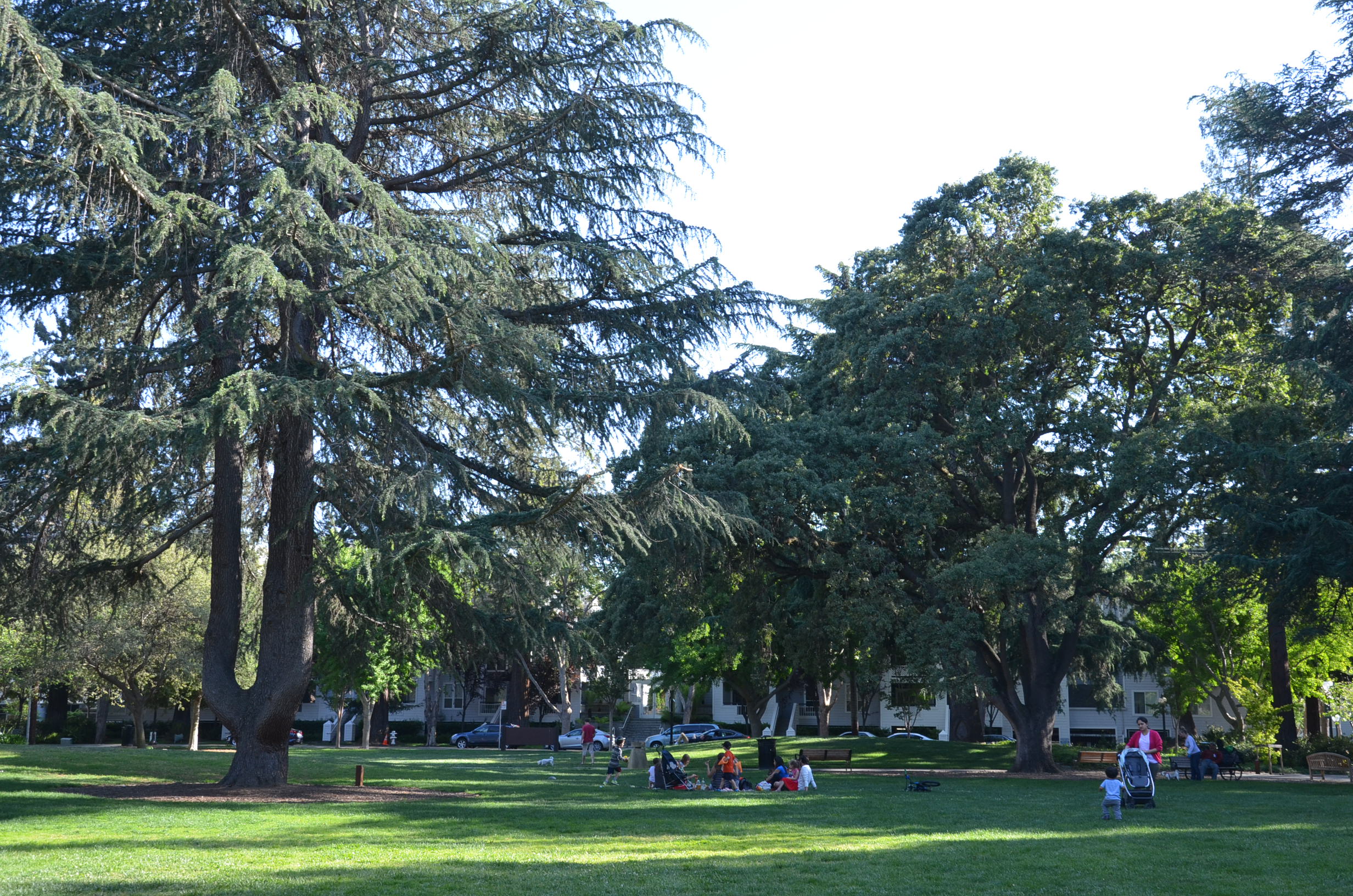 Отдельного упоминания достоин парк на заднем дворе библиотеки. Он очень зеленый, красивый, уютный. Люди здесь сидят, лежат, отдыхают, читают, бегают, ходят босиком, гуляют в костюме кота, играют с детьми, катаются на велосипеде, репетируют танцы в балетных пачках, катаются на роликах.