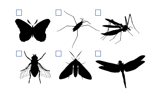 Внимательно рассматривайте два первых ряда насекомых в течение полутора минут. Запомните шесть насекомых и буквы, которыми они обозначены. Затем посмотрите на нижний рисунок и скажите, какая буква соответствует каждому насекомому. Сравните с оригиналом и исправьтесь, если допустили ошибку.