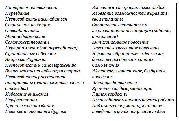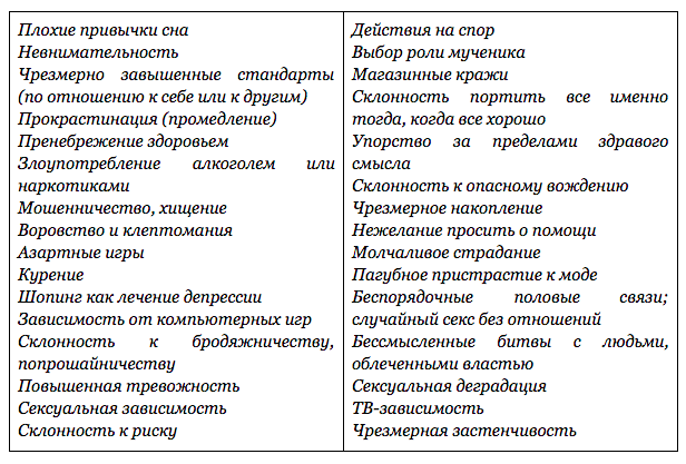 Порой мы даже не подозреваем, что наши пристрастия и обыденные поступки — путь к саморазрушению. Прокрастинация и переедание, избегание всеобщего внимания, неуверенность в себе, пребывание на плохой работе или продолжение неудачных отношений, легкомыслие и неумение слушать становятся источником ненужных переживаний.