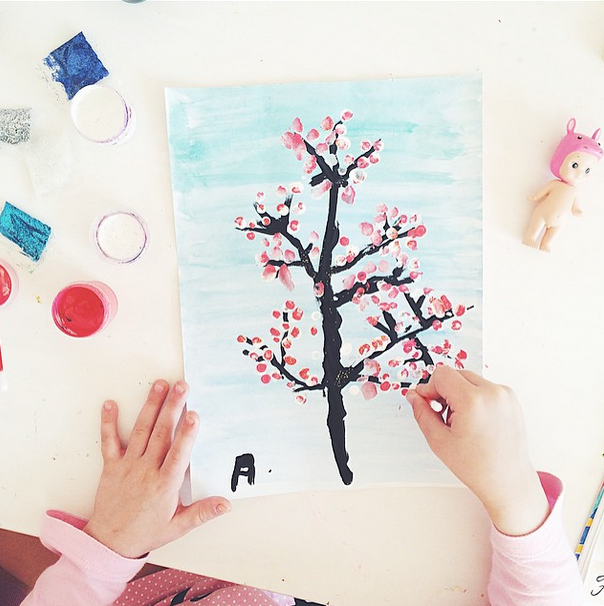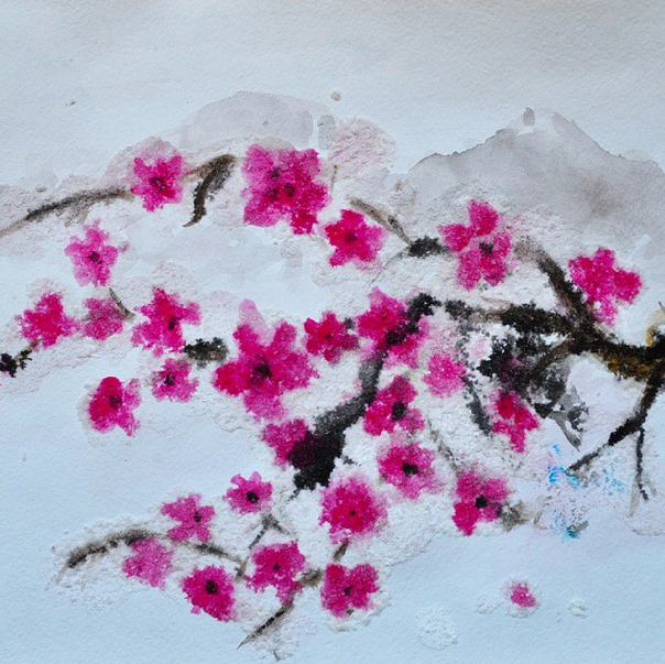 Рисование по соленой акварели мы превратили в настоящую апрельскую историю: пришла весна и зацвела вишня(я нарисовала веточку вишни), но погода резко испортилась — пошел дождь (капаем разбавленным клеем), а затем вообще пошел снег (сыпем соль), всю ночь вишня простояла в снегу… С утра я предложила Вике разморозить вишню и оживить цветы и веточки волшебными красками (Вика капала краску на проглядывающие сквозь соль цветочки и веточки). На рисунке свершилась магия, и весна вернулась, теперь очень ждем ее в реальной жизни!