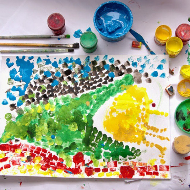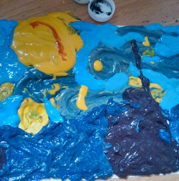 В первом туре нужно было сделать работу в технике пуантилизма, поэкспериментировать с текстурами и узорами, штампуя их с помощью разных предметов.