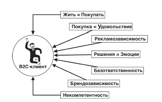В отличие от C-клиента на решения B-клиента о закупке практически не воздействует мода и система сверхпотребления. Закупщик розничной сети приобретает те же товары с целью увеличить прибыль, зная о слабостях С-клиента. При этом личное отношение закупщика к закупаемому товару неважно. Главное — выгода.