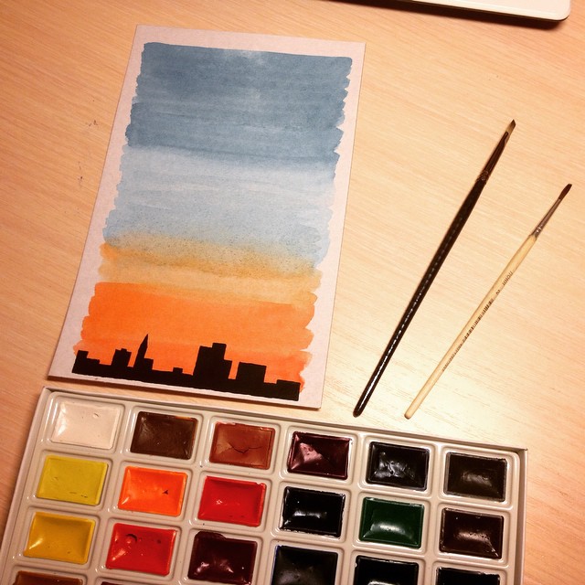 Если рисовать акварелью, при смешивании синего и оранжевого на той границе, где происходит переход, получается зеленый. Но в природе такого нет. Есть только оранжевый и только синий. Плавный переход. Понять анатомию рассвета… Вот то, что у меня получилось в первой и во второй попытке: