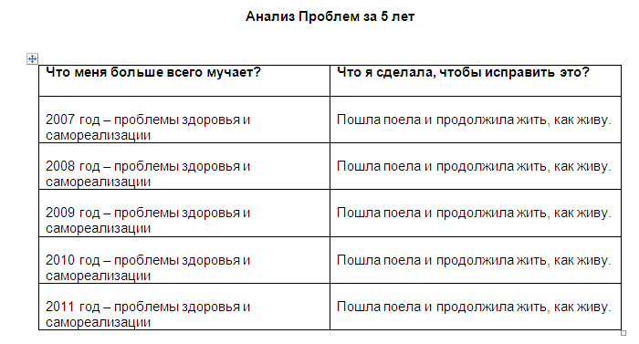 Мне никто не говорил о том, что я умру, и не клал в гроб. Просто терзало ощущение, что моя настоящая жизнь еще не началась. Это ощущение похоже на бег во сне: ты куда-то бежишь изо всех сил, но при этом видишь, что не продвинулся ни на сантиметр. В общем, в 2012 году я взяла листок и решила сделать Анализ Проблем. Я сама придумала эту штуку, и она очень простая. Листок делится на две части. В одной части нужно написать, какие у тебя стояли вопросы в определенном году, а в другой – какие действия ты предпринял, чтобы решить эти вопросы. У меня это выглядело примерно так: 2007 год — меня волнуют проблемы самореализации и здоровья. Что я сделала, чтобы исправить это? Пошла поела и продолжила жить, как живу. 2008 год — меня волнуют проблемы самореализации и здоровья. Что я сделала, чтобы их исправить это? Пошла поела и продолжила жить, как живу. И так в 2009, 2010, 2011 году…Все то же самое.