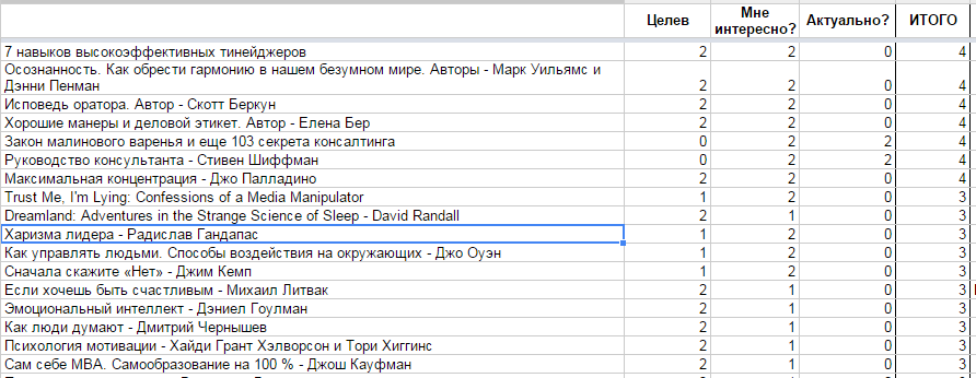 • У меня есть и белый список. Набираю туда книги по тому же принципу. Книги отсортированы по приоритету. Книжки с оценками 2 и ниже имеют мало шансов быть прочитанными. Уж слишком много литературы выходит, да и уже выпущено. Третий параметр – актуальность для меня в данный момент.
