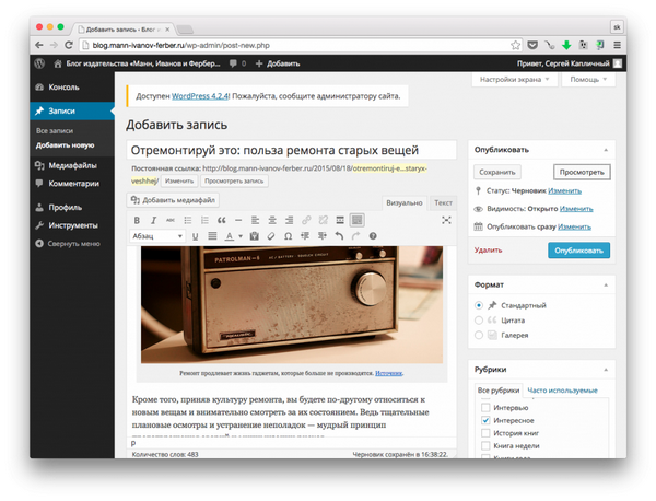 Любая статья начинается с плана и набросков. Их я делаю в текстовом редакторе и там же множество раз правлю. Затем текст проходит проверку в Орфограммке на наличие ошибок и передаётся Главреду, который помогает мне избавиться от лишних слов. Я ещё раз редактирую получившуюся статью и добавляю её в Гугл Док, где она получает приличное форматирование и дополняется картинками. После этого снова проверяю получившийся материал и вставляю его в админку в блоге. Вот так выглядит наш блог изнутри: