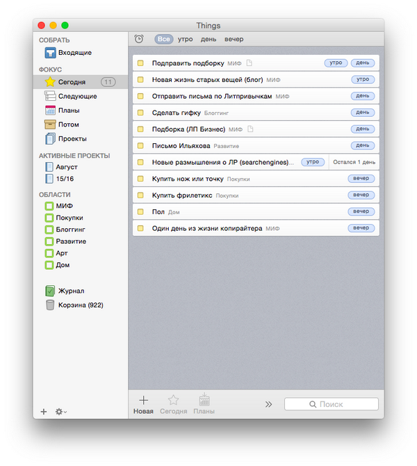 Наш контент-отдел постоянно делает блог МИФа умнее. И две недели назад я запустил рубрику «Литературные привычки», в которой общаюсь с умными людьми и освещаю их книжные пристрастия. Чтобы всё правильно работало, я составил список интересных спикеров, с которыми договариваюсь о подготовке материала. Утро как нельзя лучше подходит, чтобы накидать план, связаться с будущими героями рубрики и договориться, как и когда им удобно ответить на вопросы.
