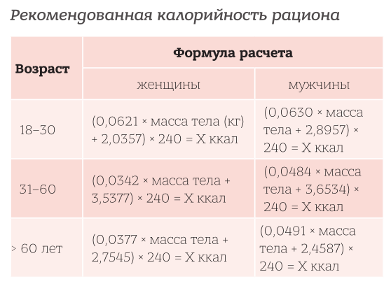 Найдите в табличке формулу, соответствующую вашему возрасту и полу, сделайте необходимые вычисления, затем умножьте полученное число на коэффициент физической активности. Это будет то количество калорий, которое необходимо вам каждый день для поддержания веса.