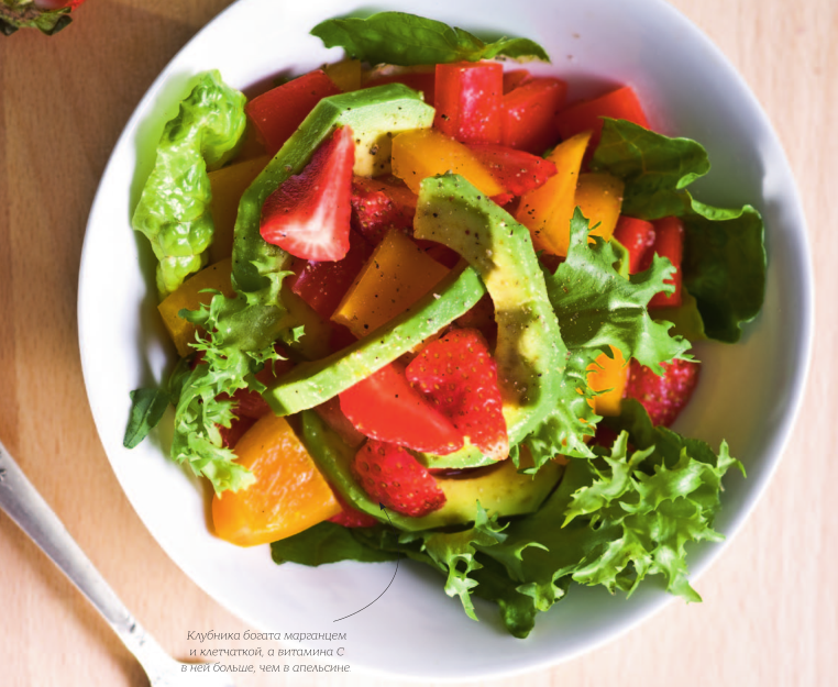 6. Авокадо, клубнику и сладкий перец перемешайте, посолите, поперчите, полейте соком лимона и еще раз перемешайте.