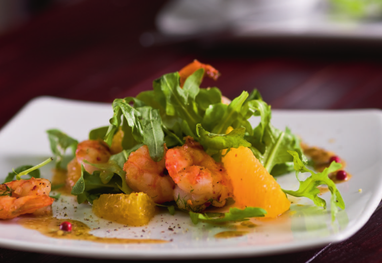 5. Рукколу промойте, обсушите, уложите на блюдо. Сверху выложите кусочки апельсина и креветки. Посолите, поперчите.