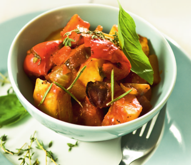 5. В форму для запекания уложите все подготовленные овощи, добавьте пассату (готовое пастеризованное томатное пюре), перемешайте и запекайте в духовке 15–20 минут при 200 °С (180 °С для духовки с конвектором).