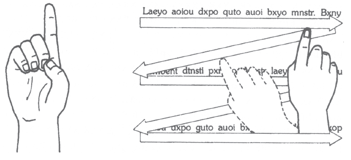 Чтобы использовать руку для увеличения скорости чтения, сначала вытяните указательный палец, как показано на рисунке. Затем ведите кончиком пальца вдоль каждой строки читаемого текста под линией слов. Когда палец дойдет до конца строки, поднимите его примерно на сантиметр, быстро переместите к следующей строке и начните процесс заново.
