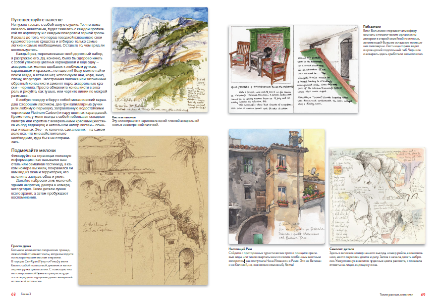 Одна из тех книг, которая завладевает умом и сердцем с первых страниц! Это подробнейший и последовательный мастер-класс по созданию функционального, личного дневника с интересными приемами и примерами работ весьма одаренных художников. В книге есть все: любовь к линии, обожание цвета, подробные и нужные советы по работе с самыми разнообразными материалами — лайнерами, гуашью, акварелью и акварельными карандашами, а также практические советы по композиции и гармонии от опытного художника и чуткого наблюдателя.
