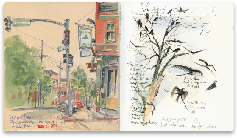Главное — сделать набросок, даже если ни на что другое не хватает времени. На этом можно остановиться. Поверьте, набросок пробуждает воспоминания ничуть не хуже, чем завершенный рисунок. Вы можете также делать заметки и в дальнейшем добавлять детали и цвет, руководствуясь ими. Развивайте свою цветовую память.