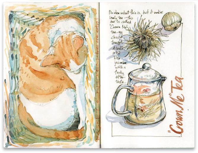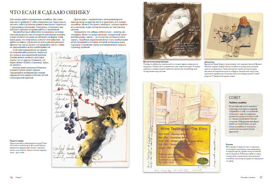 Ваш личный дневник — это ваша «песочница», в которой можно испытать новые художественные средства и техники, новые цвета и их эффекты, попробовать свои силы в разных форматах, делать заметки, не ограничивая себя. — Иллюстрация из книги