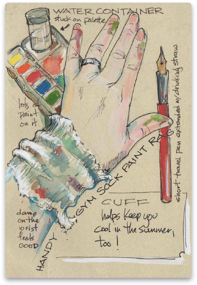 5. На пленэре удобно пользоваться «напульсником» из старого хлопкового носка. Им крайне удобно вытирать краску.