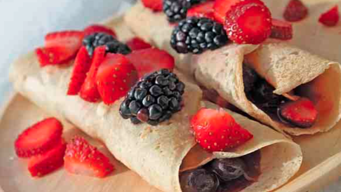 5. На половину каждого блина положите 1–2 столовые ложки фруктовой смеси. Сложите блин пополам, полейте кленовым сиропом и посыпьте корицей. Украсьте свежими фруктами.