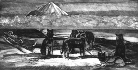 Сделал у домика остановку и покормил собак последними запасами мороженой рыбы, смешанной с мясом и жиром. Я спешил добраться до Криппла до темноты, и тут случилось несчастье: сани налетели на валун, перевернулись, и Роджер вывихнул лапу. «Бедная собака! У него снова неудача!».